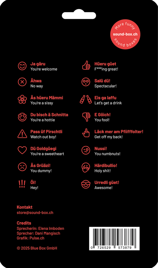 Die „Bern Box“ ist eine lustige Soundbox, die mit 16 spassigen berndeutschen Sprüchen ausgestattet ist, um sofort die Stimmung zu heben und für Lacher zu sorgen.